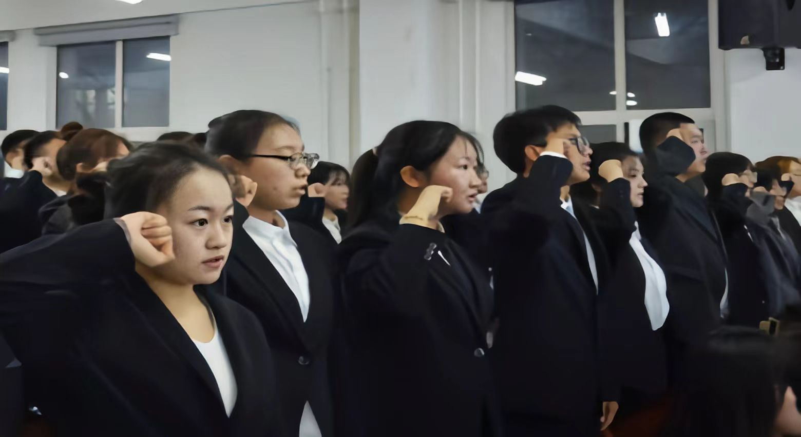 在庄严的国歌声中入团仪式正式开始,团员代表马天涌首先宣读了新团员名单,接下来老团员代表向新团员颁发团员证和佩戴团徽,最后,在优秀团员代表王宇琦领誓下,全体新老团员面对团旗,紧握右拳,以最洪亮的声音庄严宣誓。