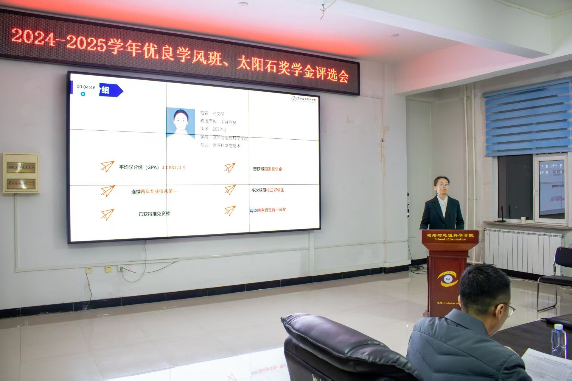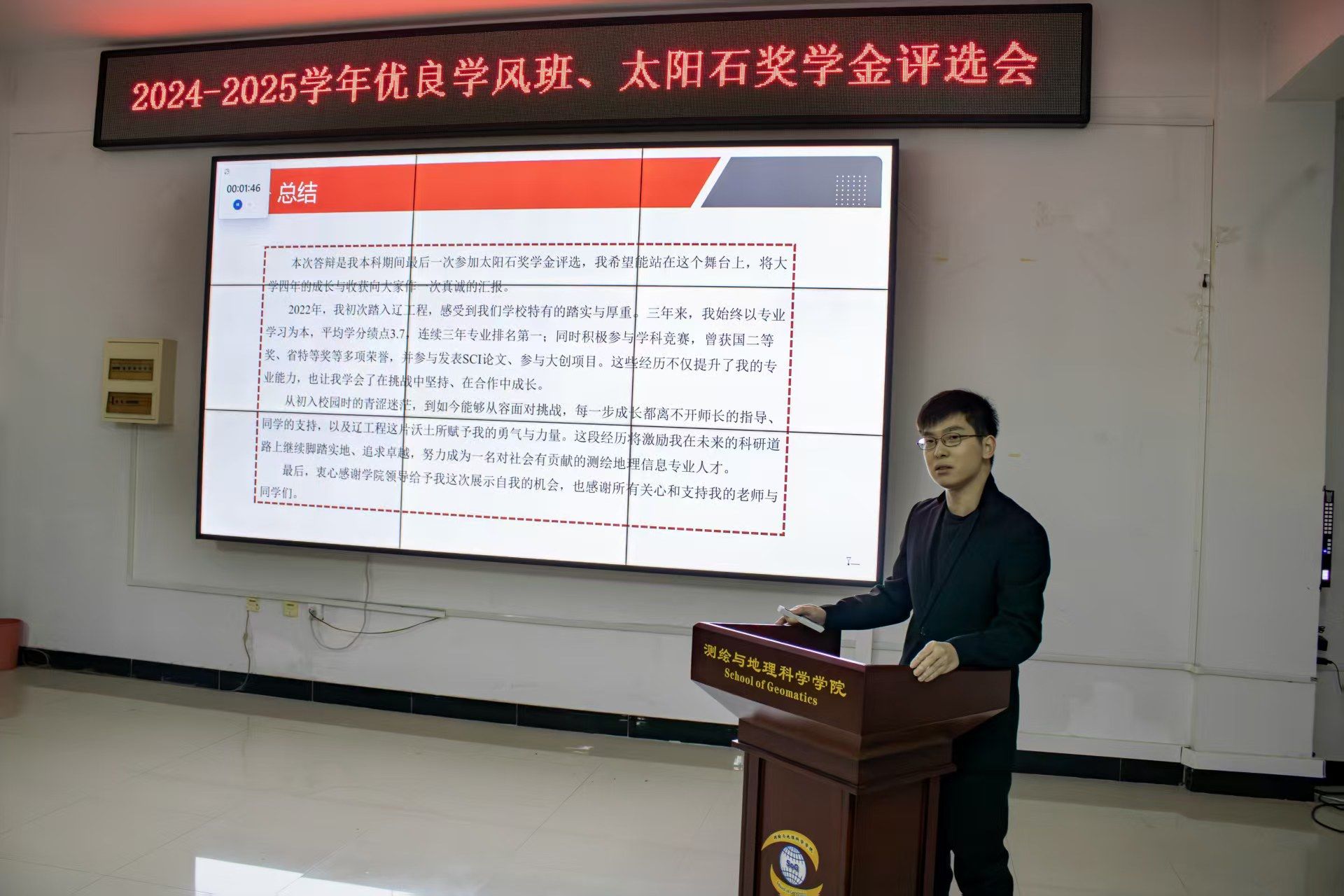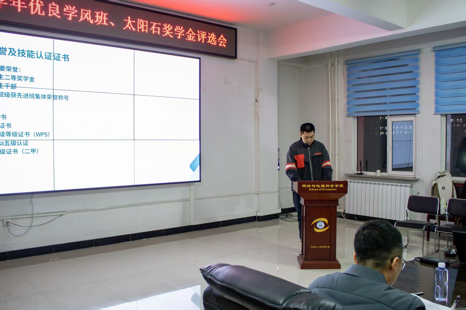 在“太阳石奖学金”评选环节,经过前期的层层筛选,共有4名优秀同学脱颖而出,进入最终的评选环节。评选过程中,4名同学通过PPT汇报的方式,全面展示了自己在学习成绩、科研竞赛、社会实践等方面的突出成绩,生动诠释了如何将太阳石精神融入到日常的学习和生活中,以实际行动践行初心使命。