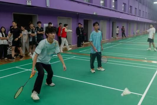 比赛现场气氛热烈,竞技与友谊并存。男单比赛力量与速度兼备,女单选手则展现出细腻的技巧与顽强的韧性。双打项目中,男双的强力进攻、女双的严密防守以及混双的默契配合,不断赢得观众掌声。特别设置的师生组队环节成为赛事亮点,老师们走出课堂,与学生并肩作战。混双比赛中,师生搭档默契配合,老师以丰富的经验掌控节奏,学生以充沛的活力冲锋在前,这种亦师亦友的互动不仅增进了彼此了解,更在挥拍与奔跑间建立起深厚的师生情谊。学院党委王崇倡书记亲临现场,不仅为选手们送上暖心鼓励,更亲自挥拍上阵,以实际行动诠释了师生同乐的内涵,将现场氛围推向高潮。经过激烈角逐,各项目优胜选手脱颖而出,他们用汗水赢得了荣誉,更收获了友谊与成长。