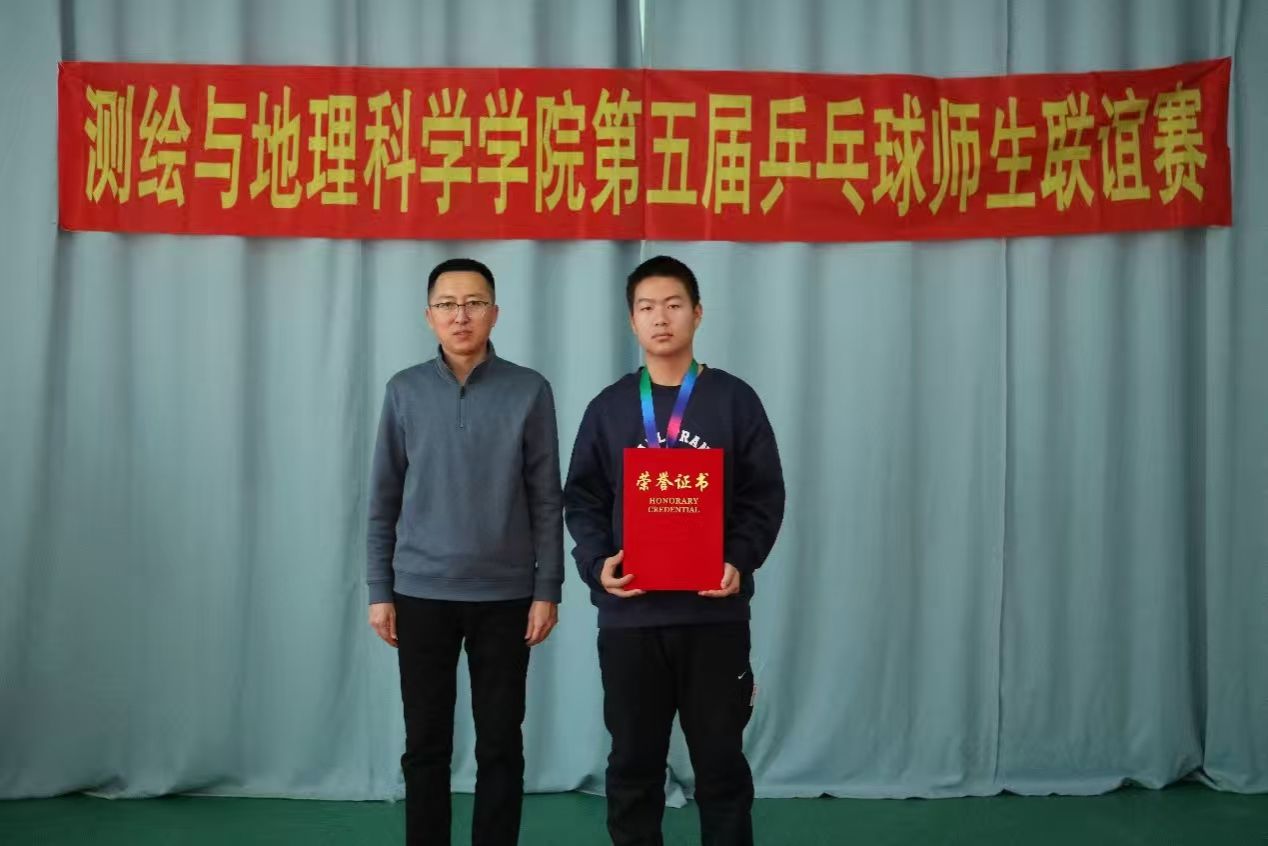 此次活动共设置男单、男双、女单以及女双四个比赛项目。采用抽签的方式进行对决,每场比赛采取三局两胜制。比赛现场气氛热烈,“乒”搏精神充分展现。师生同台竞技,既有凌厉的扣杀,也有稳健的防守;讲台上的谆谆教诲化作了球台上的默契配合与相互鼓励。方寸球台之间,银球飞舞,不仅比拼了技艺,更传递了浓厚的师生情谊与团队精神,生动诠释了“以体育人、以赛促融”的办赛宗旨。经过多轮精彩角逐,比赛圆满落下帷幕,陈恺伦获得一等奖,孙朱强获得二等奖,于占一获得三等奖,安微、张宏佳获得优秀奖。一等奖:陈恺伦