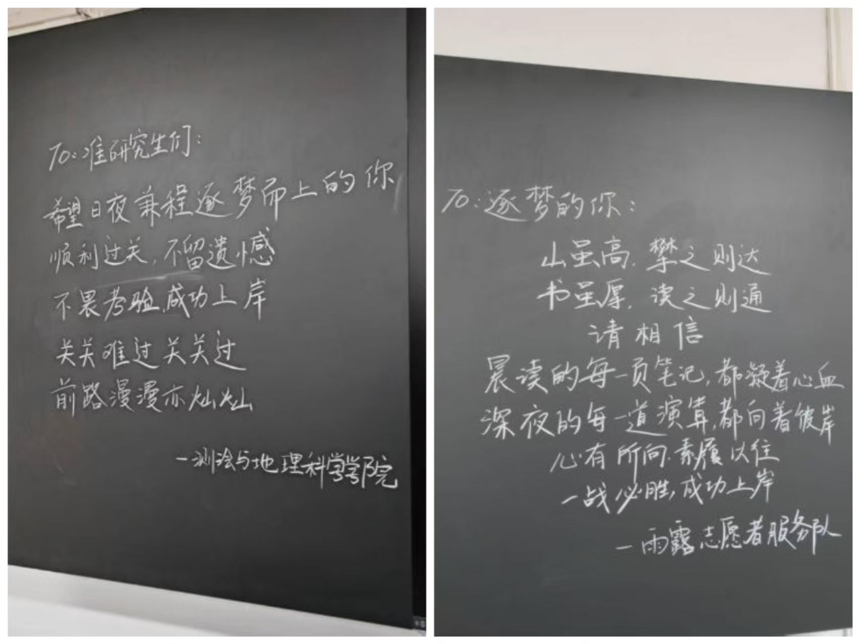 本次考研志愿服务活动,是测绘与地理科学学院深入践行“奉献、友爱、互助、进步”志愿精神的一次扎实体现,展现出学子之间守望相助、携手并进的真挚情谊。活动通过精准对接考研群体的实际需要,以“小而精、专而暖”的服务模式,提升了志愿工作的针对性与感染力,进一步增强了学院的凝聚力和向心力。愿所有考研学子承载着这份温暖与祝福,执笔为剑,不负耕耘,在未来的征程中绽放更加灿烂的光芒!