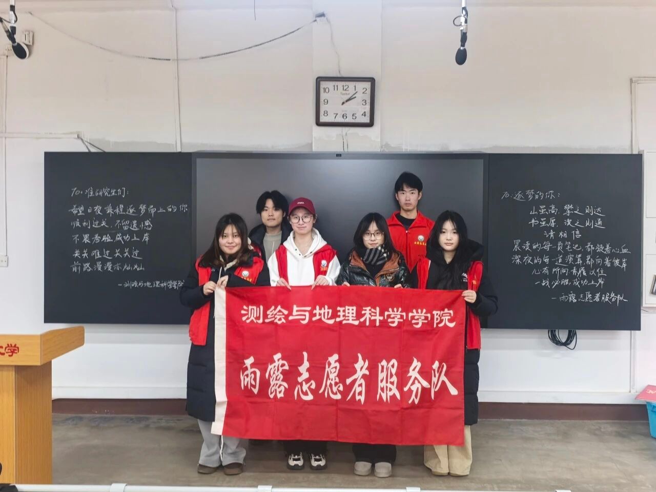 为护航考研学子安心赴考、传递校园互助温情,测绘与地理科学学院雨露志愿者服务队于2025年12月20日至21日全国硕士研究生招生考试期间,组织开展了考研志愿服务专项行动。活动聚焦考生实际需求,通过细致周到的后勤保障与情感支持,着力营造温暖、有序的考试环境,生动诠释了学院的人文关怀与团结精神。