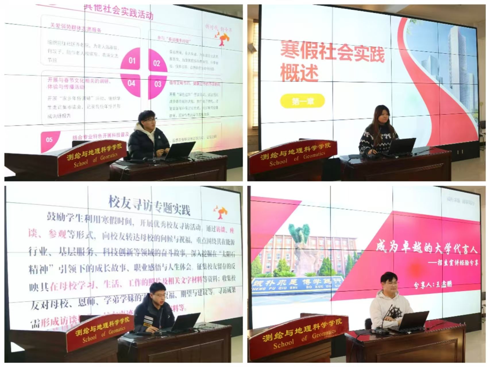 在经验分享环节,优秀学生代表依次发言。“寒假招生宣传专项实践活动”代表王鑫鹏结合自身宣讲经历,分享了实用技巧与创新思路;“返家乡专题实践”代表焦恩惠介绍了项目申报流程与实践收获;“校友寻访专题实践”代表于添宇交流了访谈测绘66-1班校友杨伦教授的心得体会;白煜涵同学则分享了其他类社会实践活动中的见闻与思考。四位同学的分享内容详实、情感真挚,为即将开展实践的同学们提供了生动参考与有益借鉴。