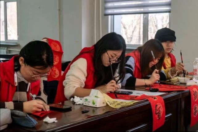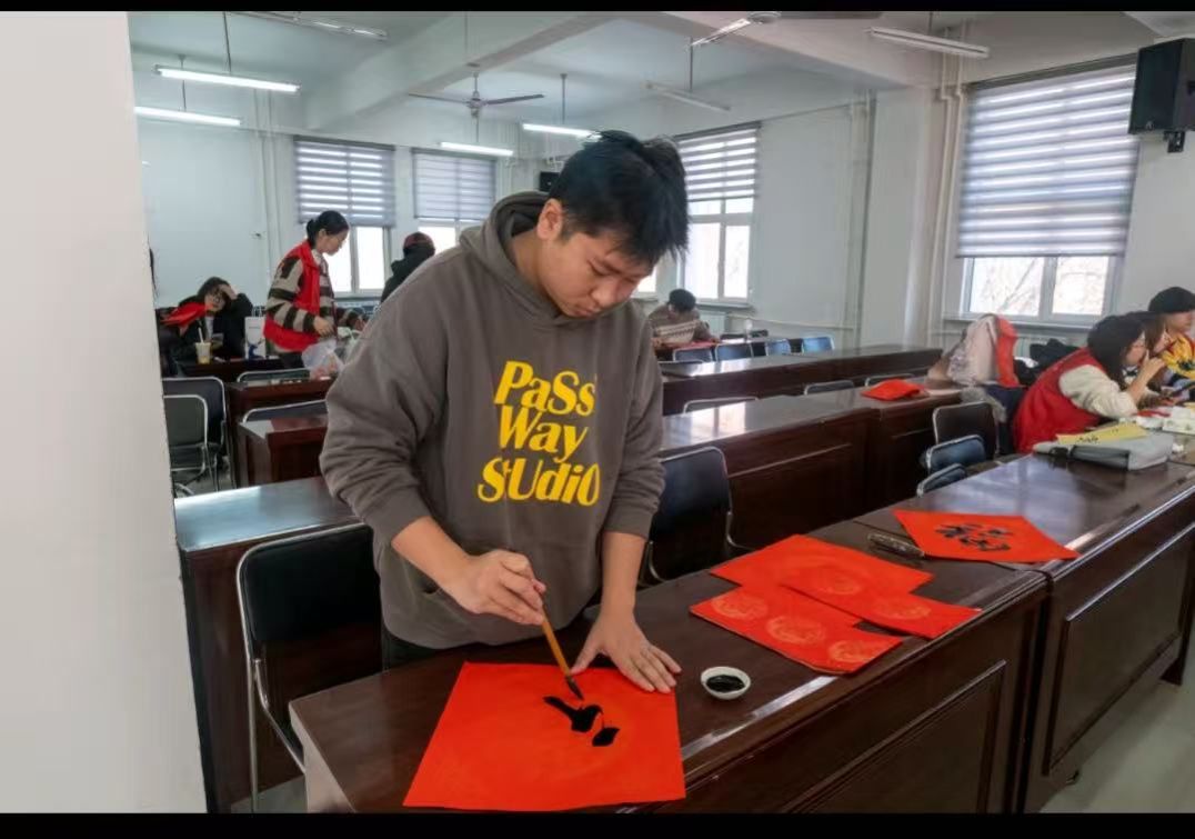 活动现场分为剪纸与书法两大体验区。剪纸区内,同学们在指导下专注学习折纸、描样、剪刻等技艺,于精雕细琢中定格巧思,一张张红纸化作灵动窗花与饱满“福”字。书法区则墨香盈室,同学们蘸墨挥毫,为学院各职能办公室与优秀寝室落笔成联。一副副楹联承载着真挚祝愿,既向辛勤工作的师长致以敬意,也为同窗情谊与美好生活寄寓期许,笔墨之间,情谊悄然流转,成为连接师生、温暖彼此的独特纽带。