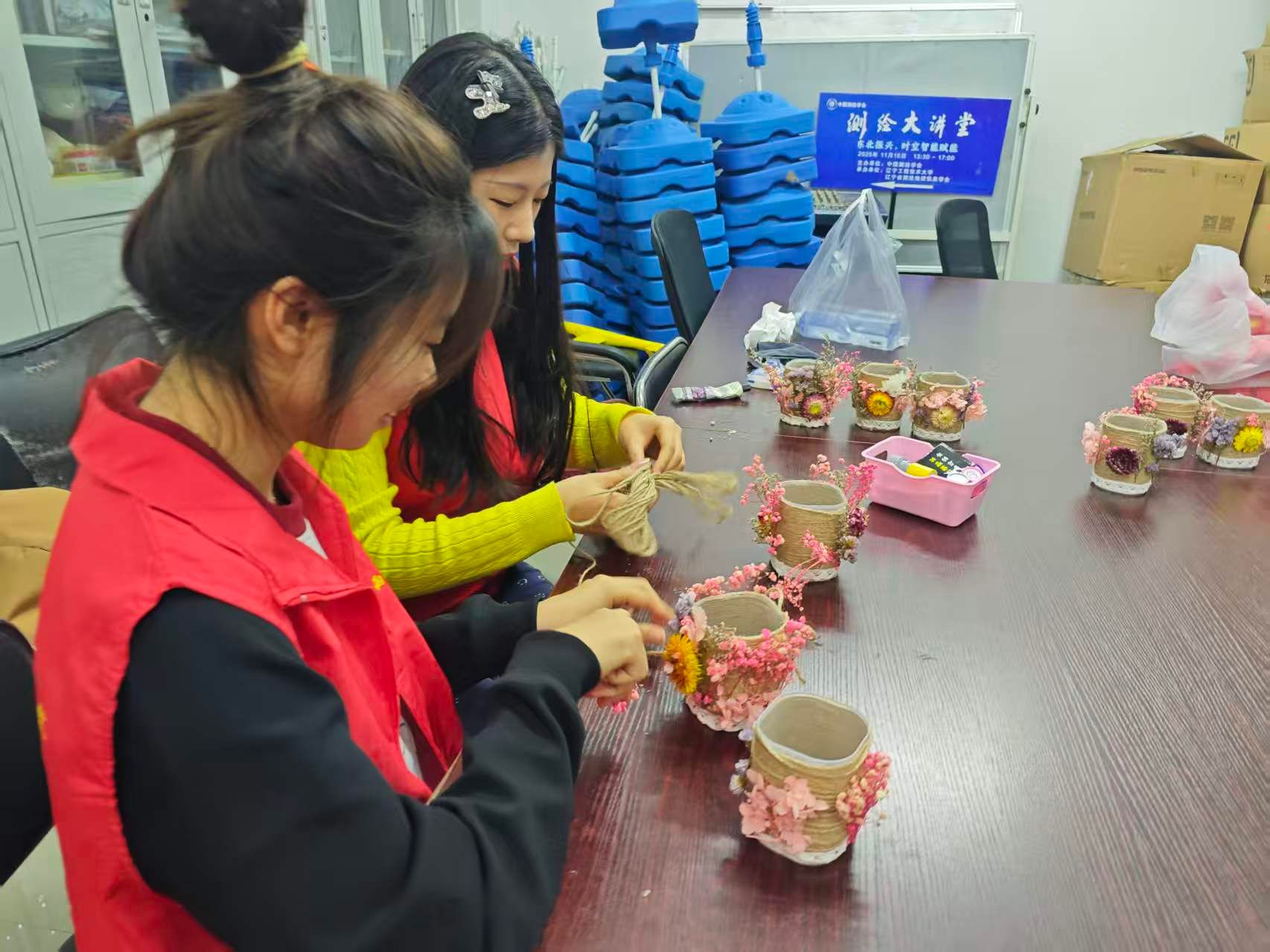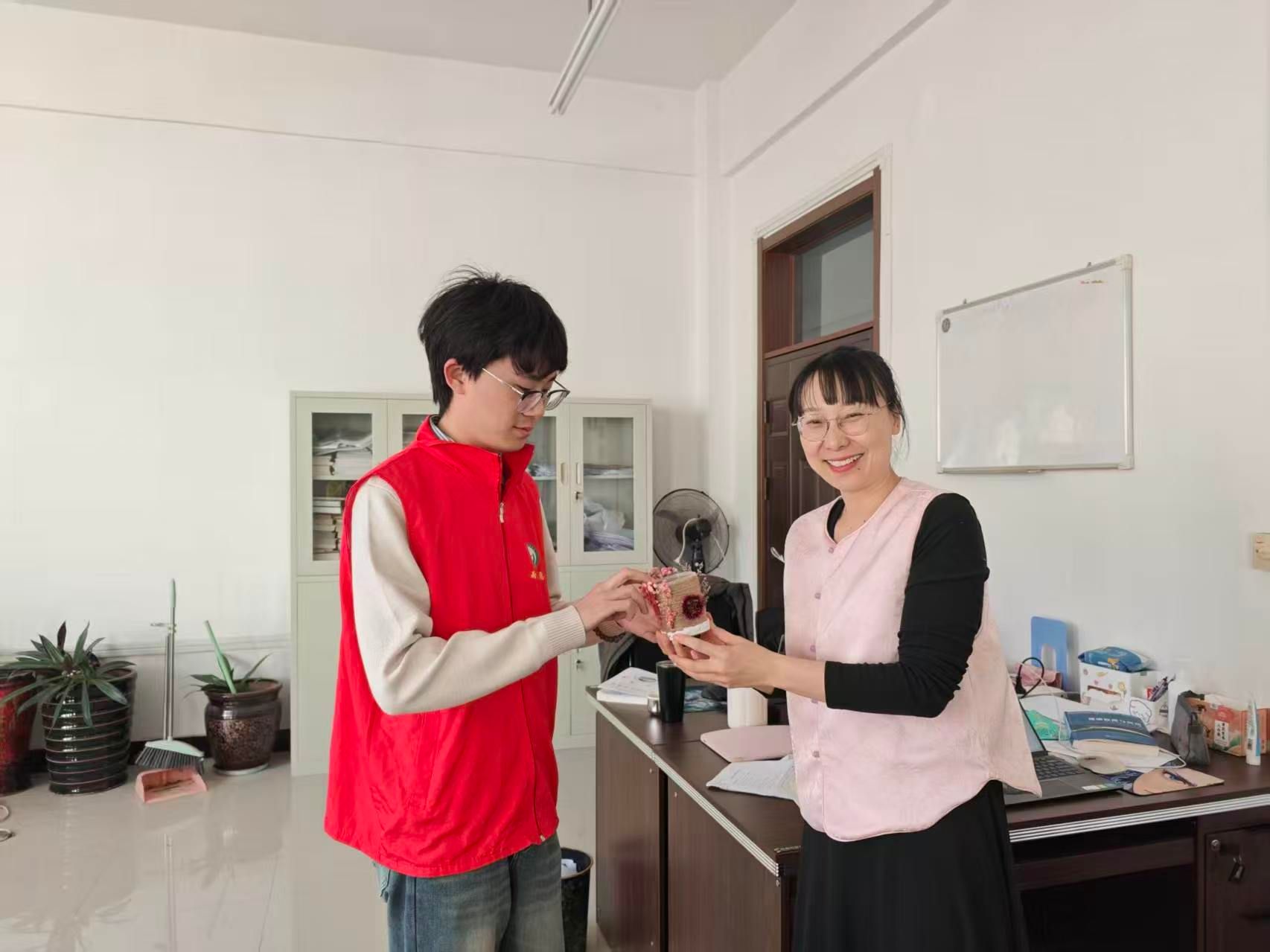 活动中,志愿者们围坐一起,以素雅的笔筒为容器,精心搭配粉白满天星、明黄向日葵与淡紫干花,用心修剪、巧妙组合。每一枝花的摆放、每一处色彩的呼应,都凝聚着学生们对师恩的感念。随后,志愿者们分组前往各教研室与办公区域,将承载着真挚祝福的花艺笔筒亲手送至女教师手中。接过这份别致礼物的老师们笑容温暖,或轻声叮嘱,或真诚感谢,师生之间真挚的互动,勾勒出春日校园里温情脉脉的画面。