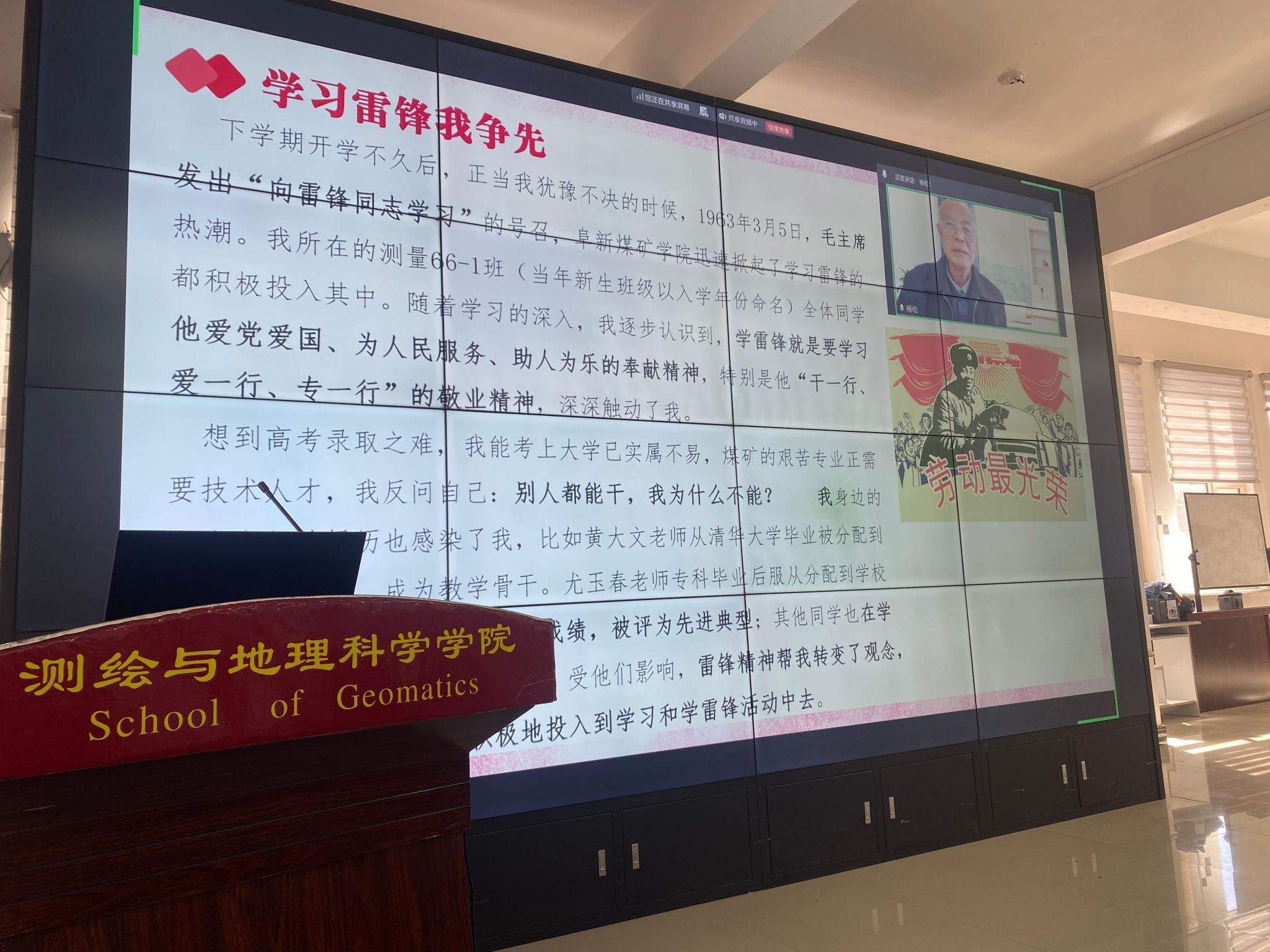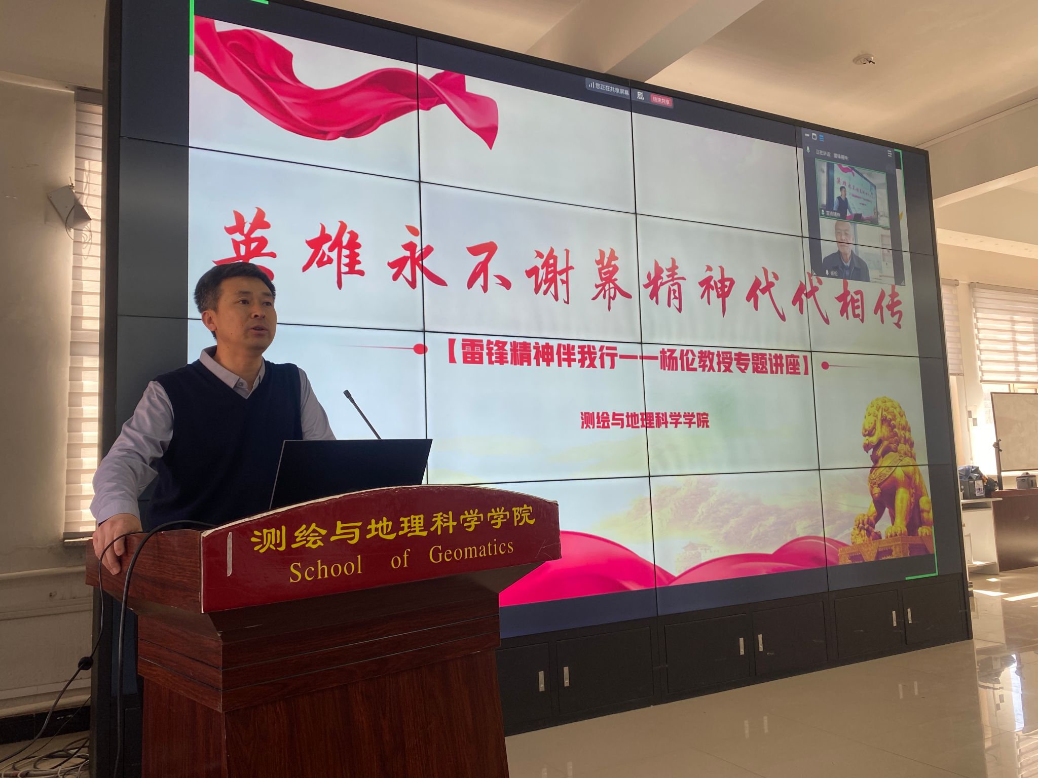 为深入学习贯彻雷锋精神,引导青年学子坚定理想信念、厚植家国情怀,3月25日,测绘学院在测绘楼207隆重举行“英雄永不谢幕 精神代代相传”主题报告会。本次活动邀请国务院特殊津贴专家、国家二级教授、83岁高龄的杨伦教授担任主讲人。杨伦老先生是我校知名的学习雷锋先进人物。他在六十年代前亲眼见过雷锋的光辉形象,亲耳听过雷锋的生动报告,并且终身践行雷锋精神。如今有过这种经历且仍然在世的人已寥寥无几、屈指可数,本次报告会正是为了抢救性地挖掘他学习雷锋的生动事迹。学院党委副书记范强出席本次活动,会议由学院团委书记程千主持,部分学生骨干代表参会。
